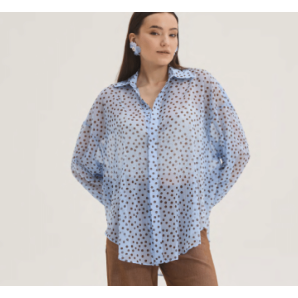 Το σιέλ πουκάμισο με τα διακριτικά μικρά πουά αποτελεί ιδανική επιλογή για να δώσεις μια ανάλαφρη και θηλυκή πινελιά στις εμφανίσεις σου. Η μακριά, loose γραμμή του εξασφαλίζει άνεση καθ’ όλη τη διάρκεια της ημέρας, ενώ ο κλασικός γιακάς και το κούμπωμα μπροστά προσθέτουν κομψή, διαχρονική αισθητική.
