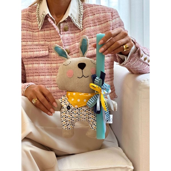 Easter candle with handmade fabric bunny, sewn with cotton fabrics.
