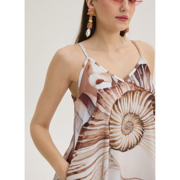 Αέρινο midi φόρεμα με εντυπωσιακό all-over print εμπνευσμένο από κοχύλια, που προσδίδει καλοκαιρινή κομψότητα και μοναδικό χαρακτήρα. Διαθέτει λεπτές τιράντες και V λαιμόκοψη που αναδεικνύουν διακριτικά τη θηλυκότητα, ενώ η χαλαρή γραμμή του χαρίζει άνεση και φυσική κίνηση. Το ανάλαφρο ύφασμα αγκαλιάζει το σώμα, καθιστώντας το ιδανικό για ζεστές ημέρες και ιδιαίτερες εμφανίσεις.