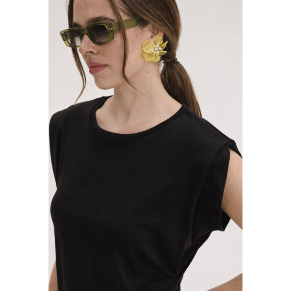 The soft texture of the fabric offers a cool feeling, ideal for hot days, while its minimal aesthetic makes it ideal for all hours — from morning appearances to evening outings with the right accessories.
