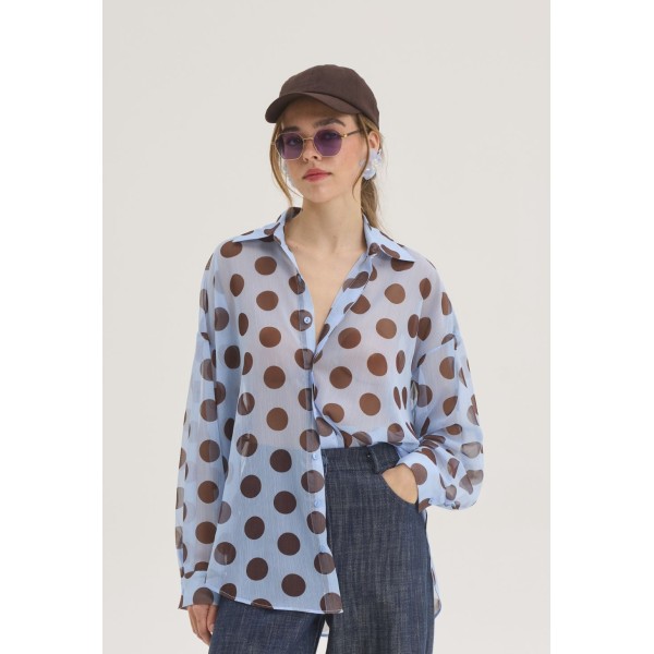 Upgrade your everyday outfit with this light blue shirt with striking brown polka dots, which combines femininity and modern aesthetics. Its relaxed, long line offers comfort and an elegant fit, while the classic collar and buttons along the front maintain its timeless character.